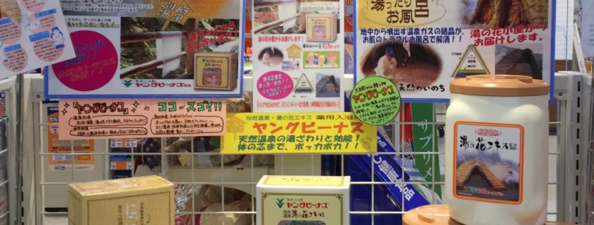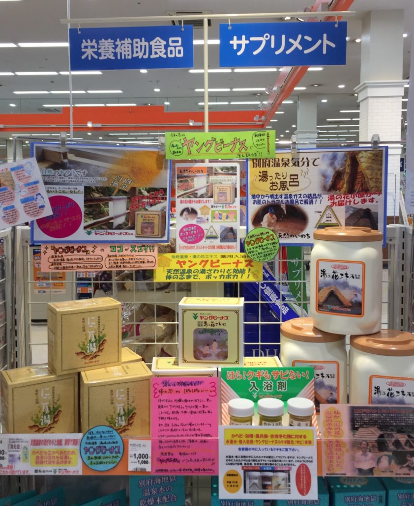 訪問時、ヤングビーナスは温泉ですよ。美人の湯と言われる別府明礬温泉の湯の花が原料です。荒れ性の方、かぶれやすい方にお勧めしますと温泉と効能の話しをさせて頂いきました。