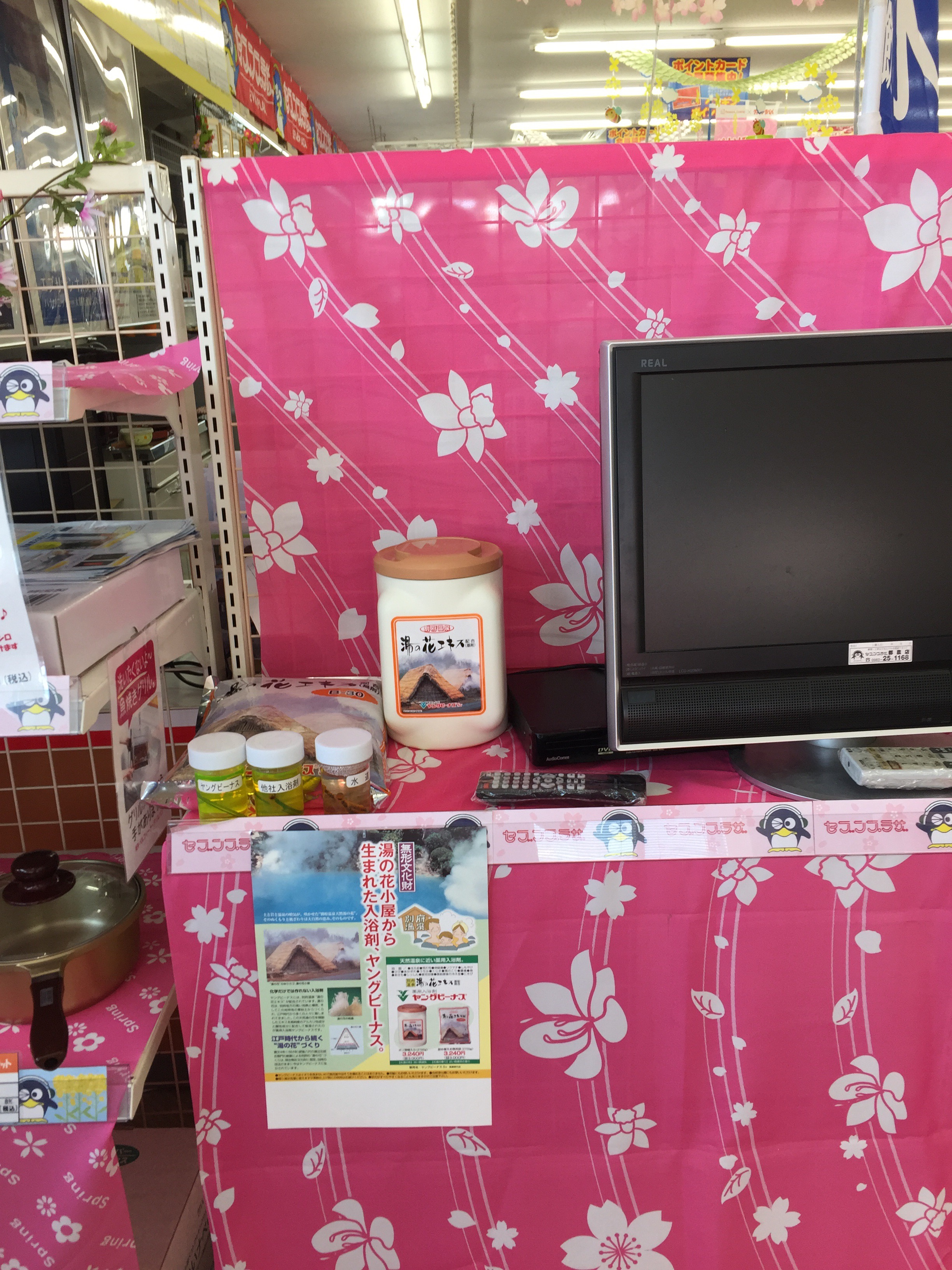 訪問時、ヤングビーナスは温泉ですよ。美人の湯と言われる別府明礬温泉の湯の花が原料です。荒れ性の方、かぶれやすい方にお勧めしますと温泉と効能の話しをさせて頂いきました。